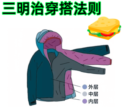 三明治穿衣法、三明治穿搭、三明治搭配でも同じ。三明治は「サンドイッチ」の意味。内层「内側」、中间层「中側」、外层「外側」と暖かく重ね着をすること。